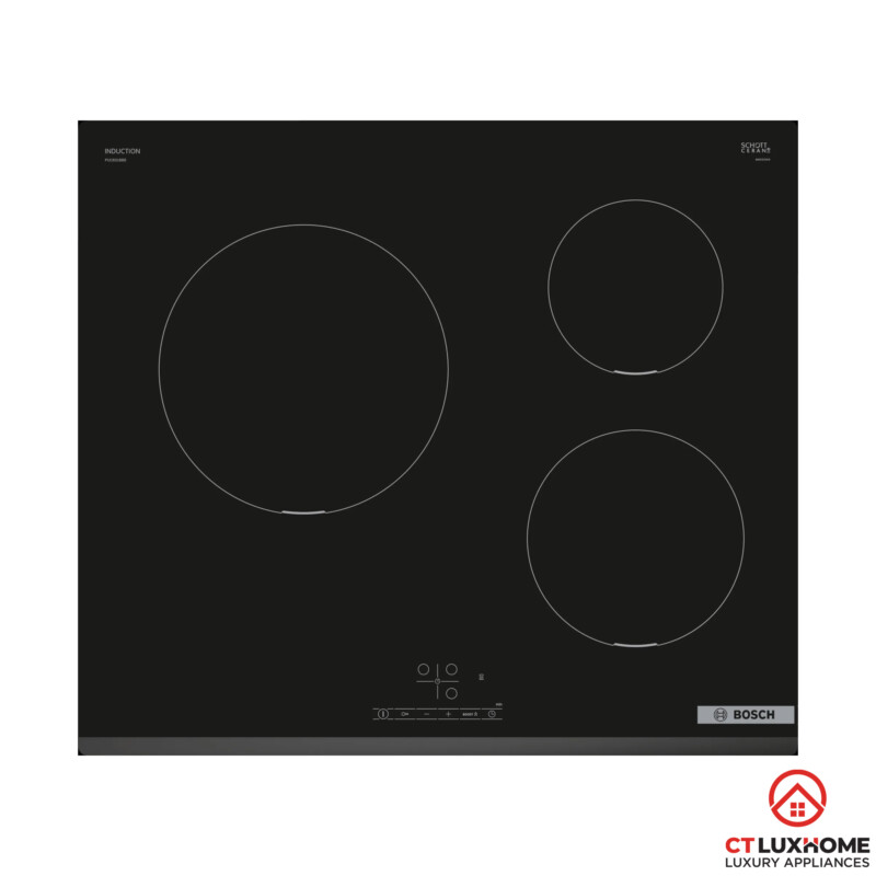 Với bếp từ Bosch PUC631BB5E có tới 3 vùng nấu riêng biệt, mỗi vùng nấu cho các kích thước và công suất như sau: