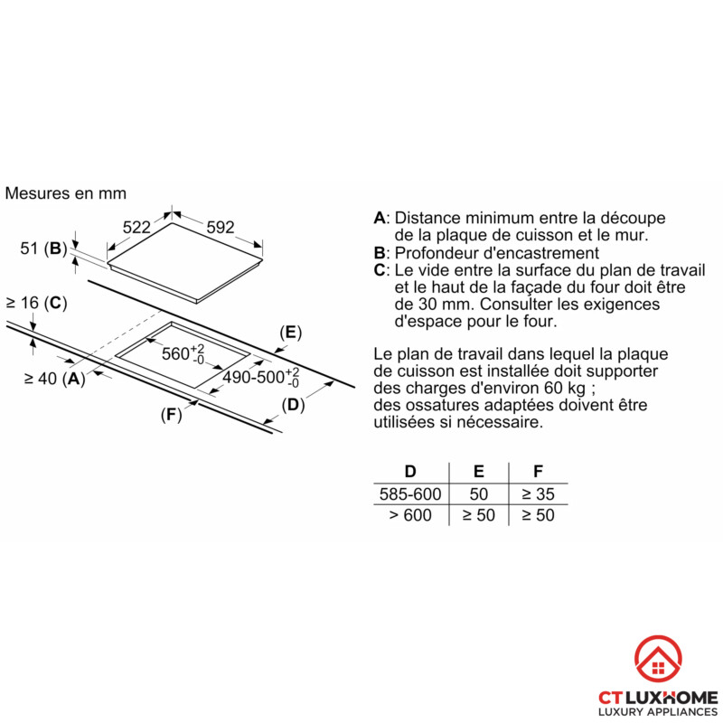 Kích thước của bếp từ Bosch PXE631FC1E là 51 x 592 x 522mm (CxRxS) với tổng trọng lượng chỉ 14.3kg.